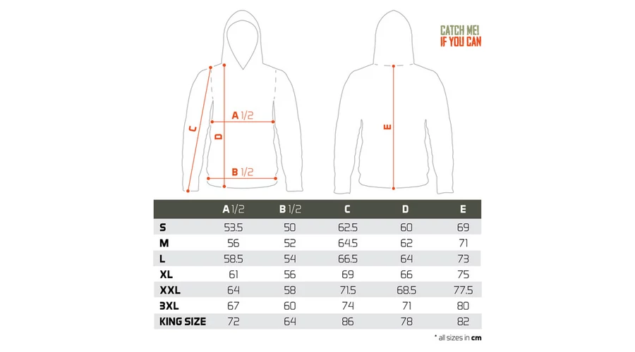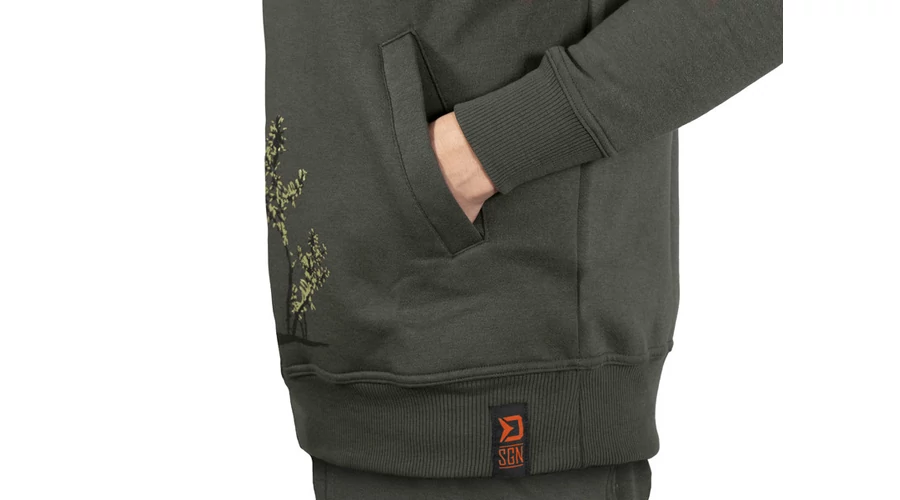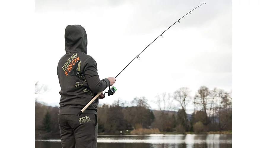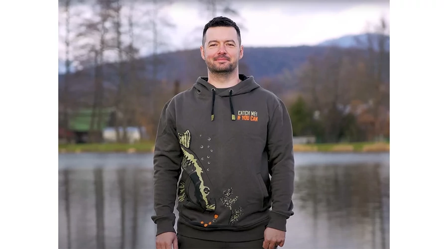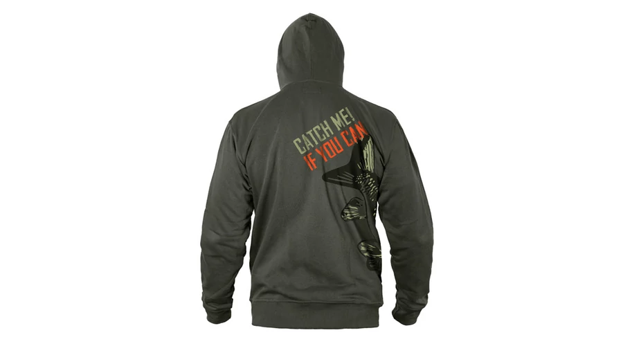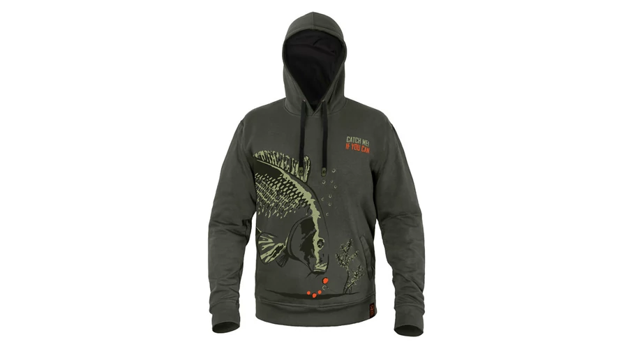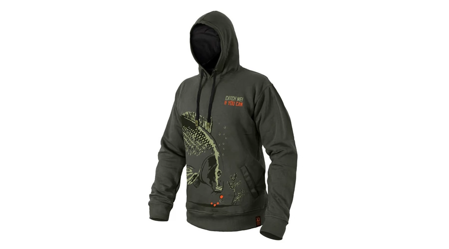 A ponty dizájnt felvonultató CATCH ME IF YOU CAN sorozat nem csak a horgászszekrények kiemelkedő darabja. A ponty motívum körbeveszi a törzs alsó részét, vázlatként vagy festményként jelenik meg, miközben minden lényeges részletet megtart. A hal épp egy maroknyi bojlit közelít meg – ez pontosan az a pillanatban, amire a horgászok várnak. A kapucnis pulóver sötétzöld színű, feltűnő narancssárga és világoszöld grafikával.
