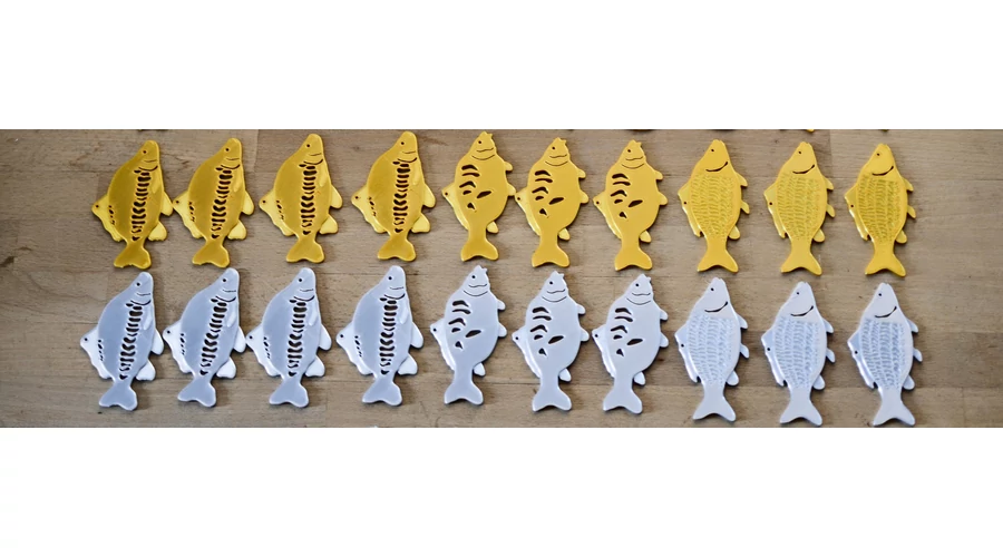 A készlet 10 db halat tartalmaz, felső részén lyukkal a fára akasztható drót vagy madzag befűzéséhez. A készletek a ponty két színváltozatában kaphatók.